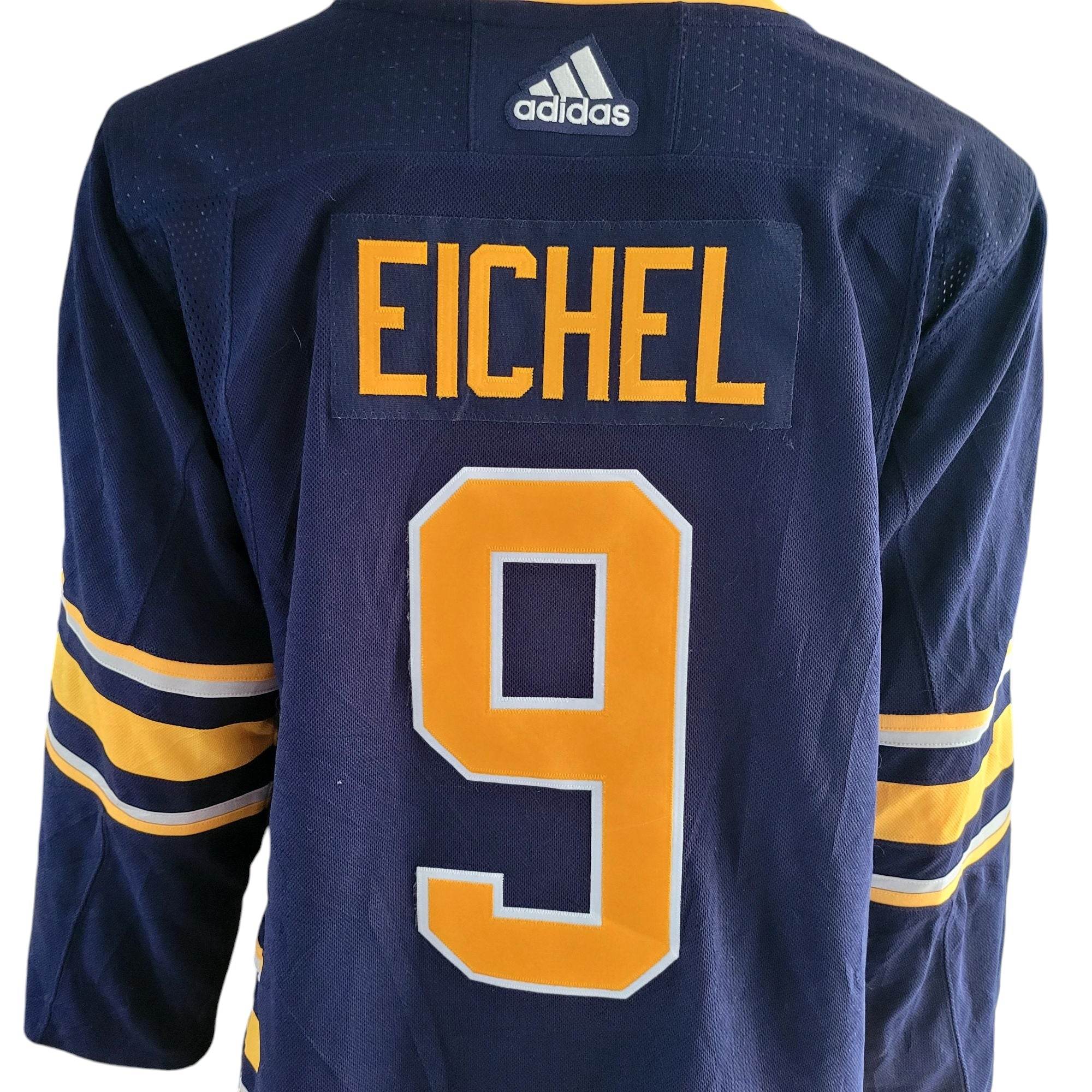 This official **Adidas Buffalo Sabres** jersey features **Jack Eichel's** name and number **9** in **gold and white stitching**. The **navy blue jersey** is accented with **gold and white stripes** on the sleeves and bottom hem.