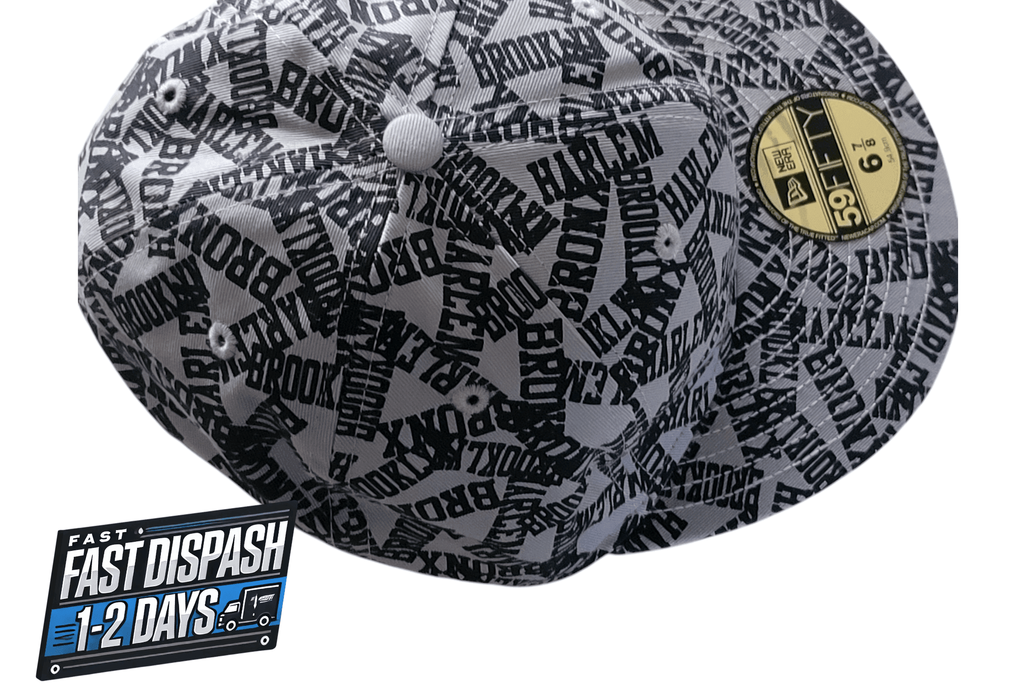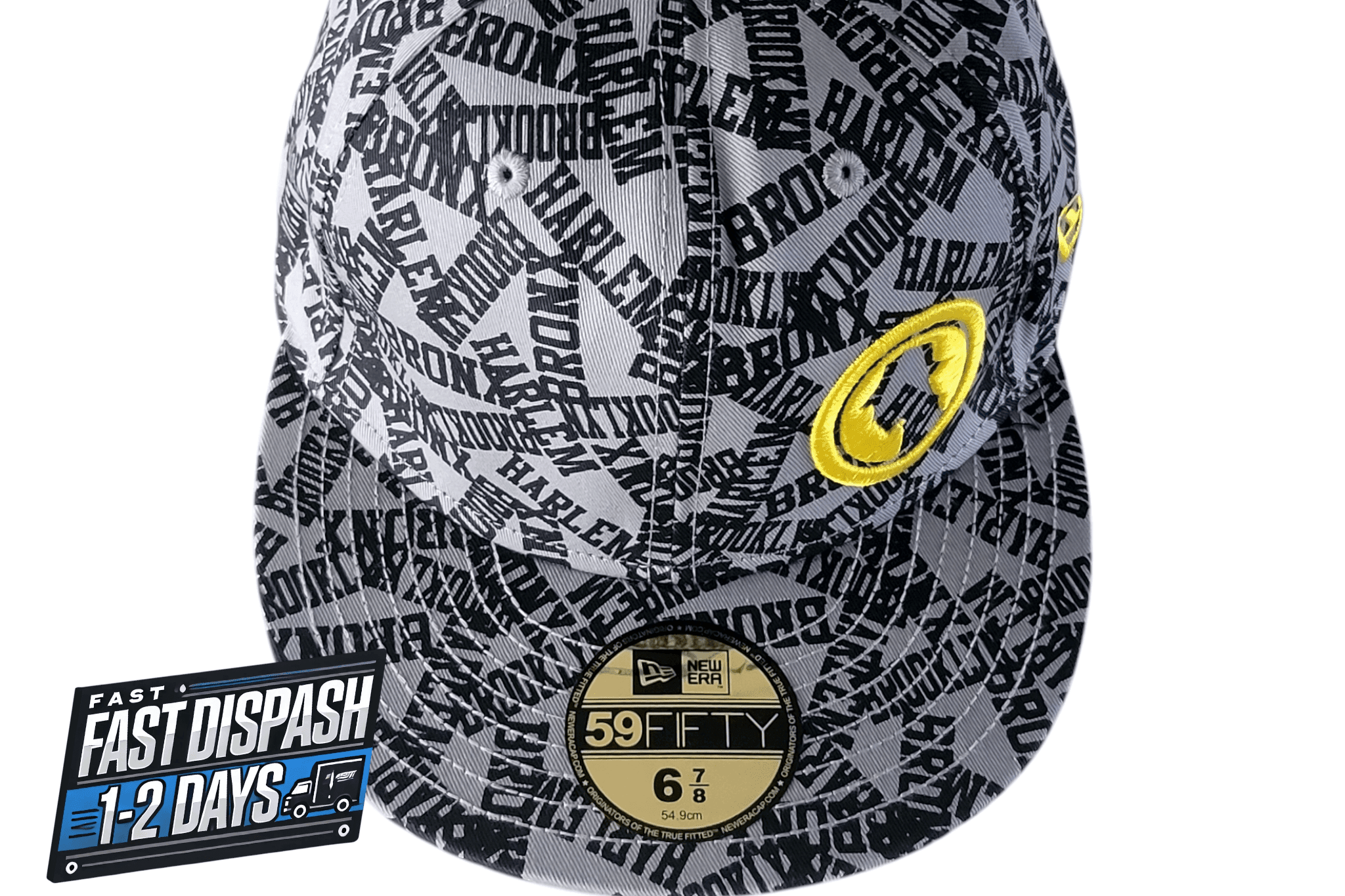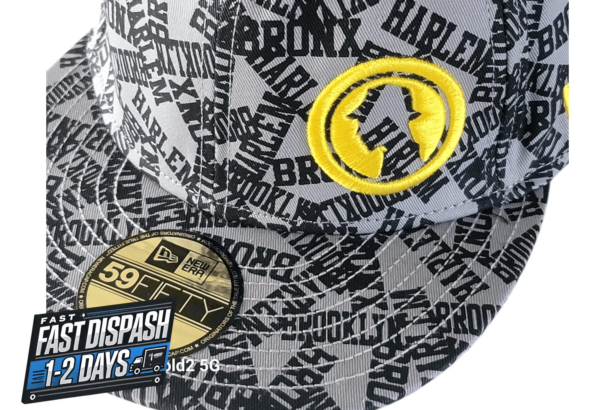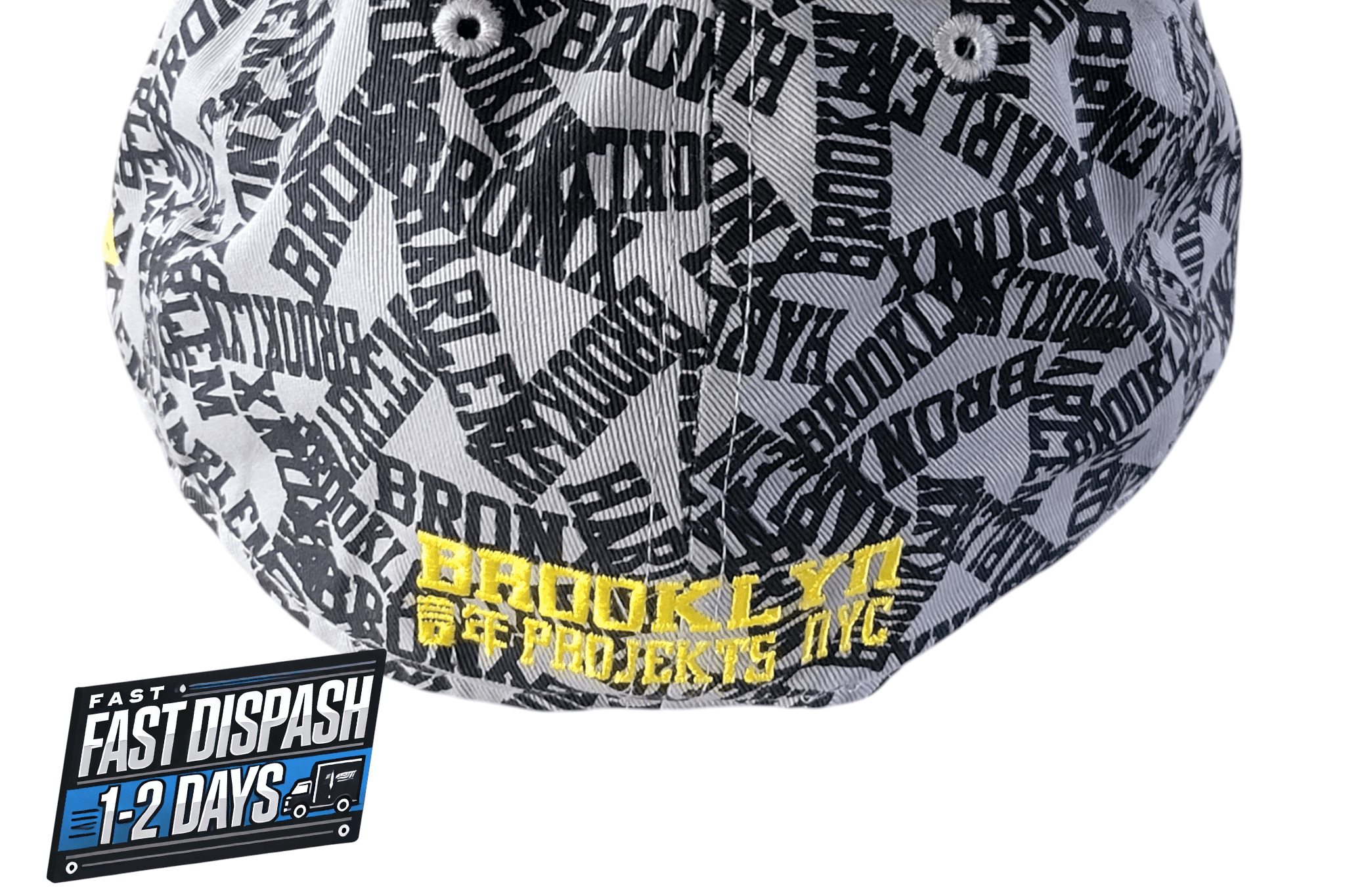 This New Era Projekts NYC 59FIFTY Fitted Cap is a striking addition for any hat enthusiast or streetwear fan. The cap is made of 100% cotton, ensuring both comfort and durability. It features an eye-catching gray background with a bold graphic text pattern highlighting iconic New York City locations such as "Bronx," "Harlem," and "Brooklyn." The cap is accented by a yellow embroidered "Brooklyn" text on the front and a luxurious Projekts NYC logo on the interior, emphasizing its unique design.